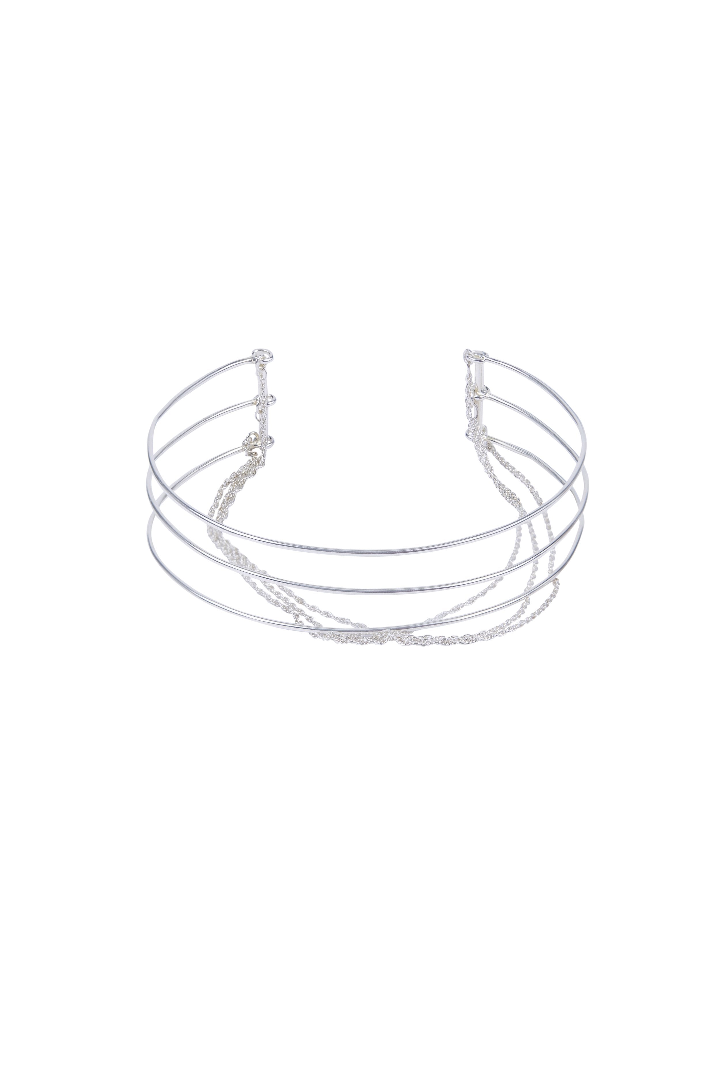 Choker de plata formado por tres aros semi rígidos y tres cadenas cordoncillo que caen en el cuello. El contraste entre la rigidez de un choker y el movimiento de las cadenas.