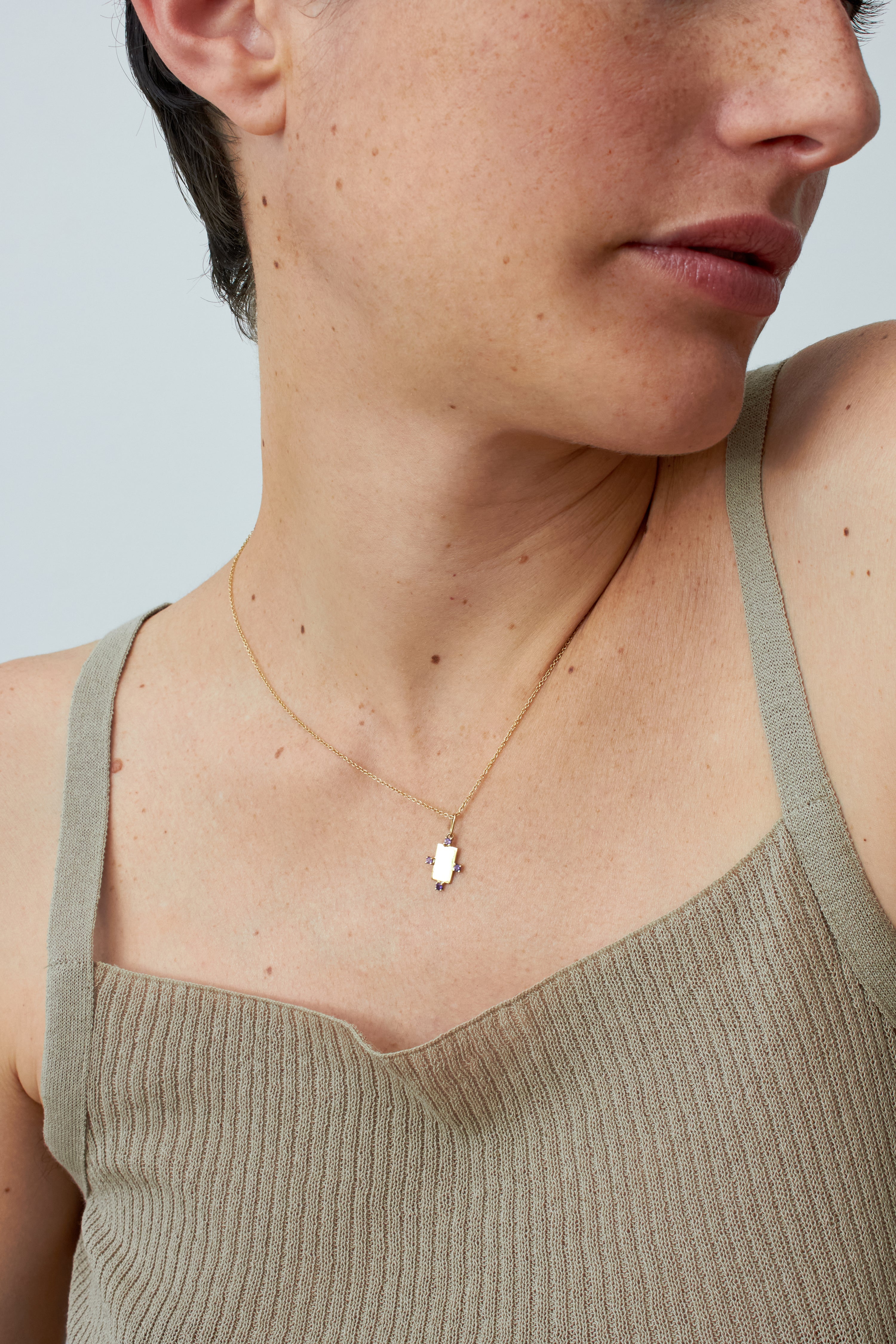 A rectangular medal framed by four claw-set diamonds. A customizable piece that can be engraved with one or more initials, a name, a date, or a word.