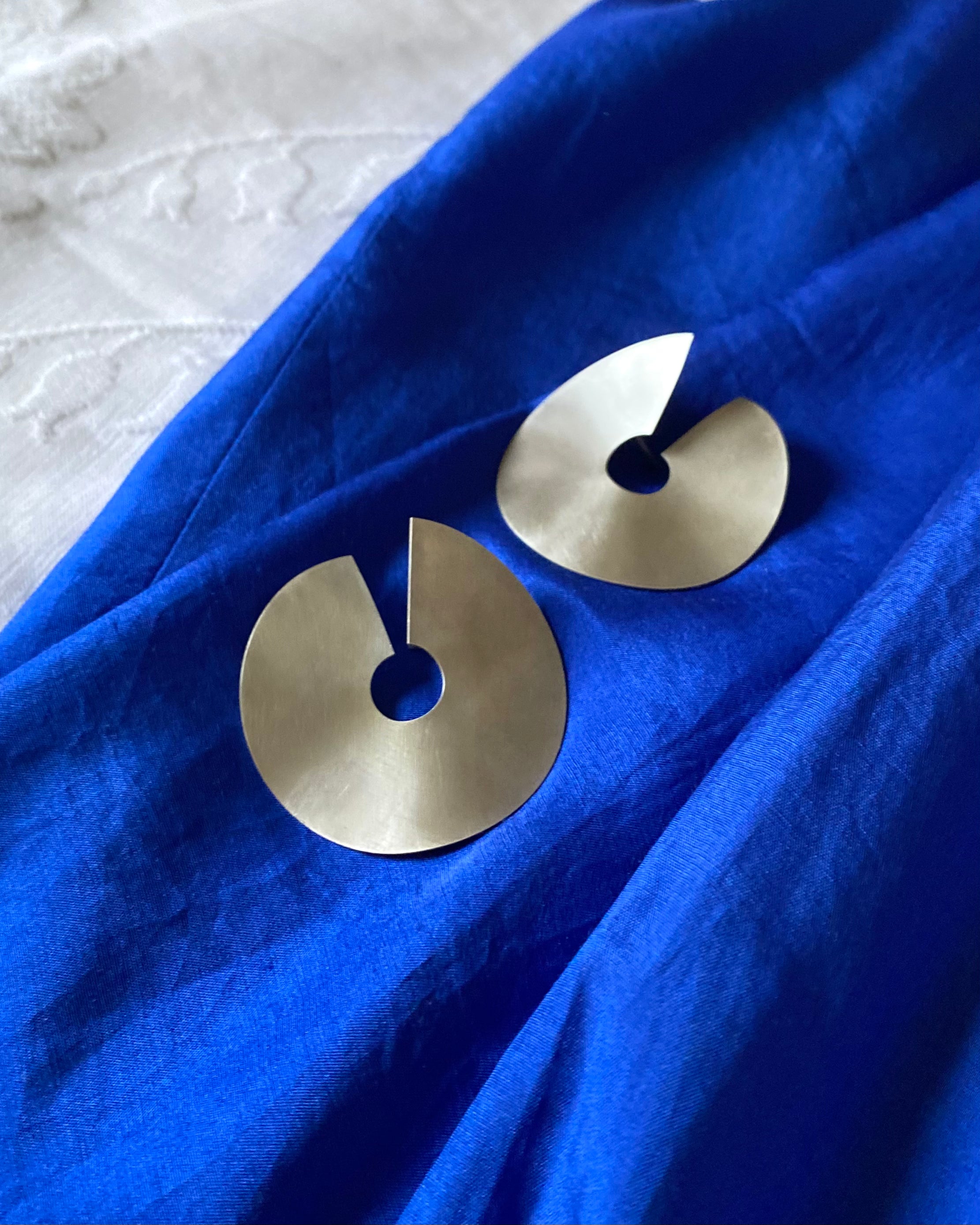 Matte silver wavy earrings. Waves that curl around the ear, starting at the front and ending hidden behind the lobe. They have been designed to be worn this way, and for this reason each earring corresponds to only one of the two ears. To identify which one goes on each one, when you put it on, the end of the circumference should be hidden by the back of the ear. If not, it will correspond to the other ear.